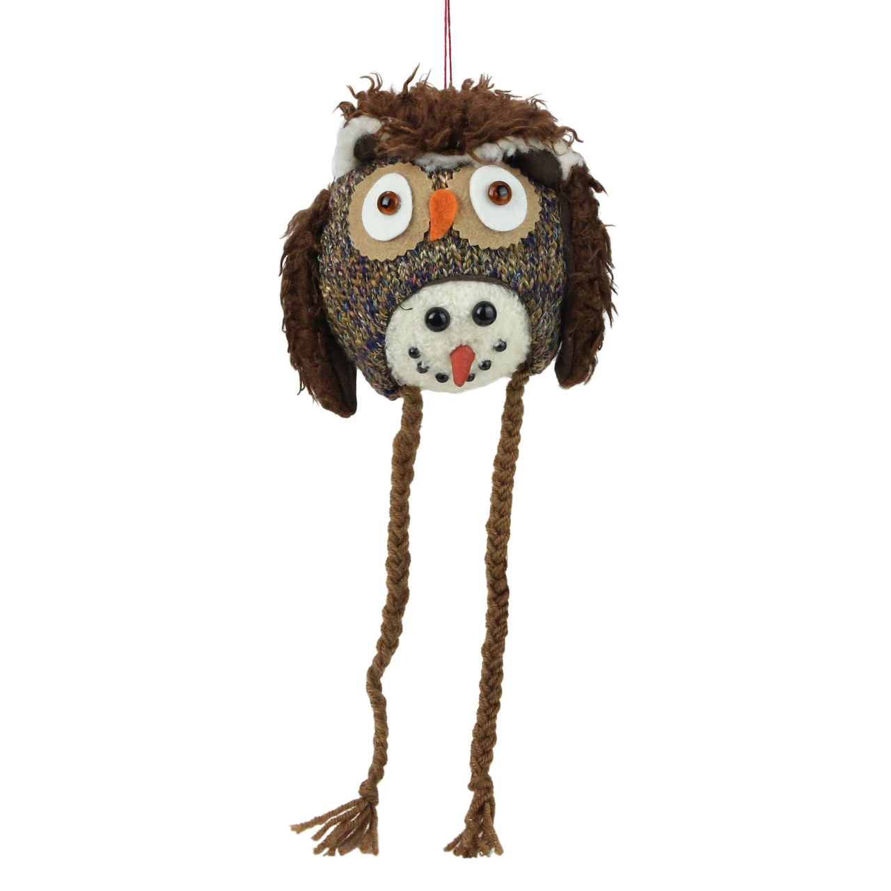Smiling snowman head accented with a soft owl shaped winter hat