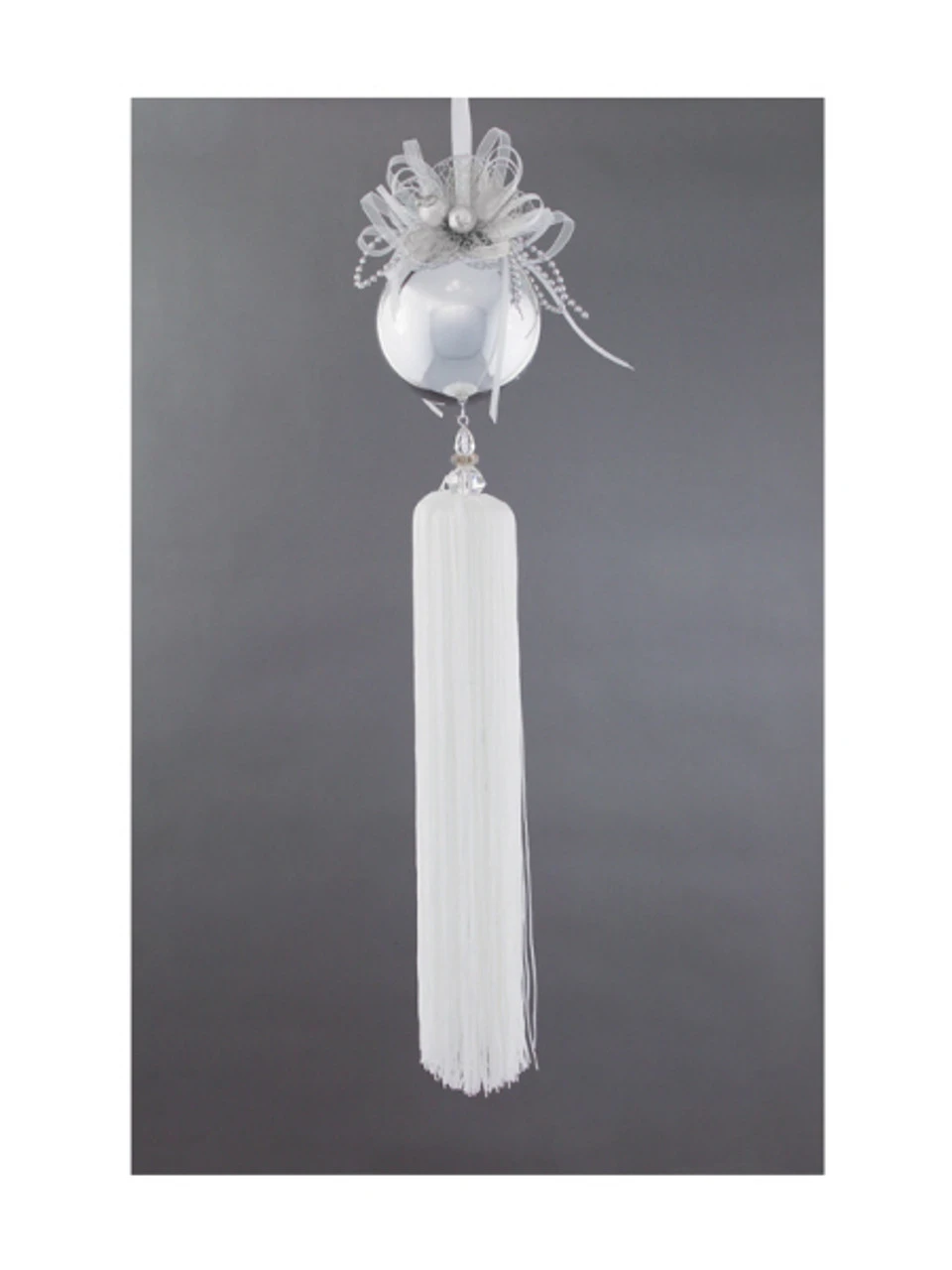 Silver ball is embellished with ornate ribbon and has dramatic decorative dangling tassels