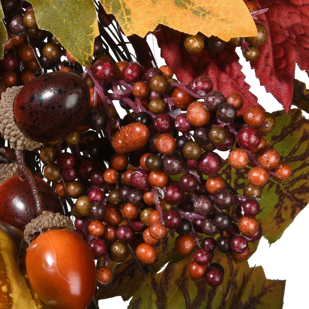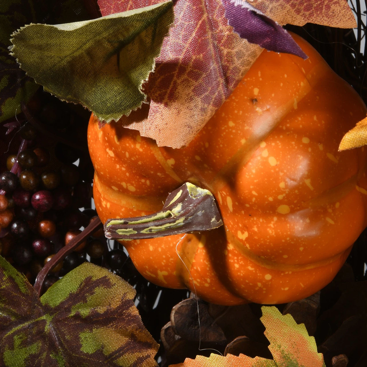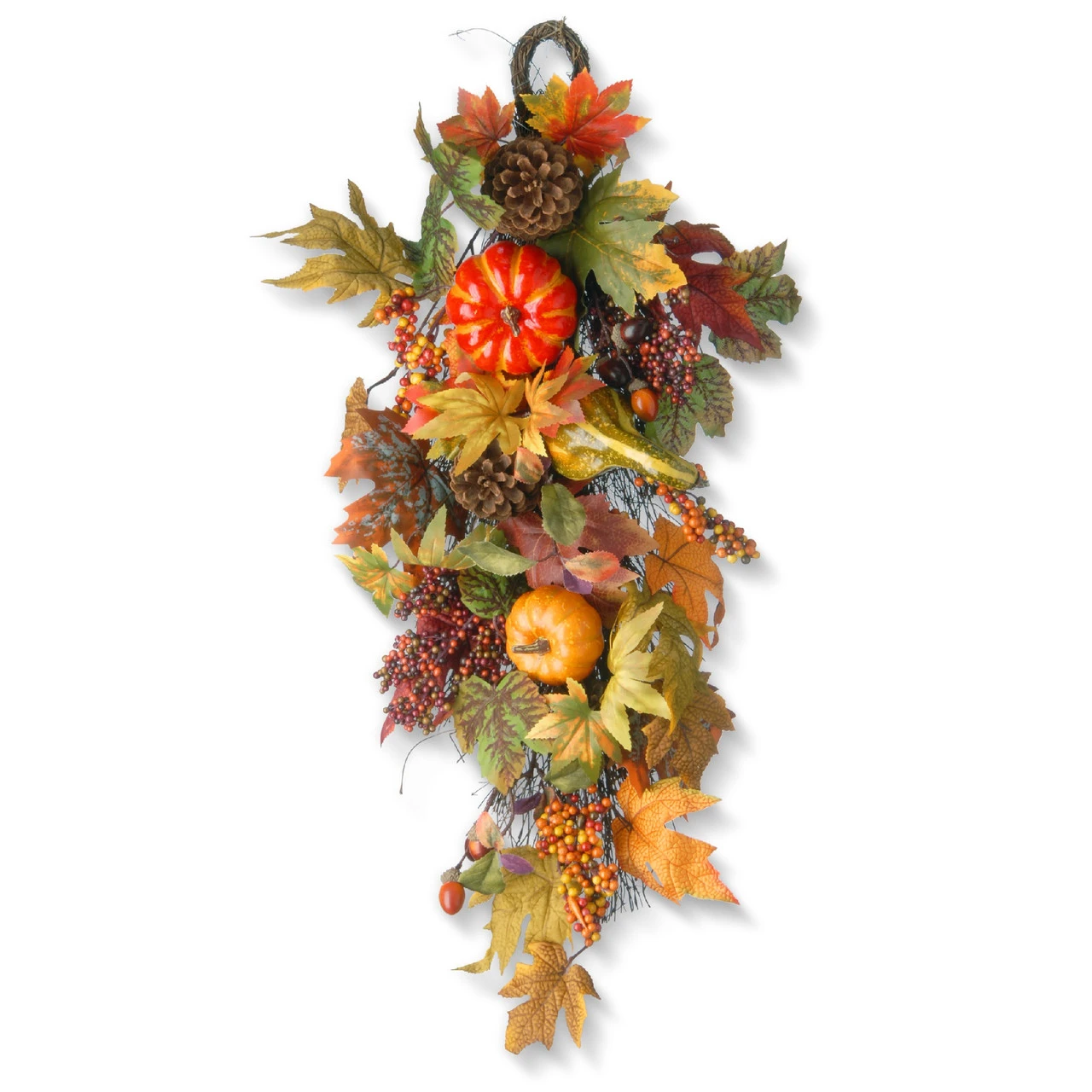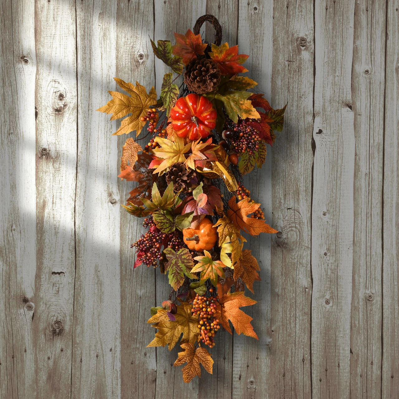 Trimmed with pumpkins, gourds, pinecones and berries
