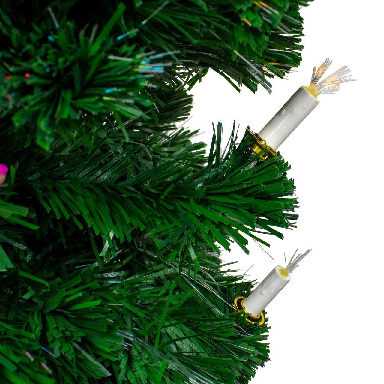 Pre-lit fiber optic tree has a multi-color wheel at base