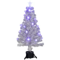 Pre-lit fiber optic tree has a multi-color wheel at base