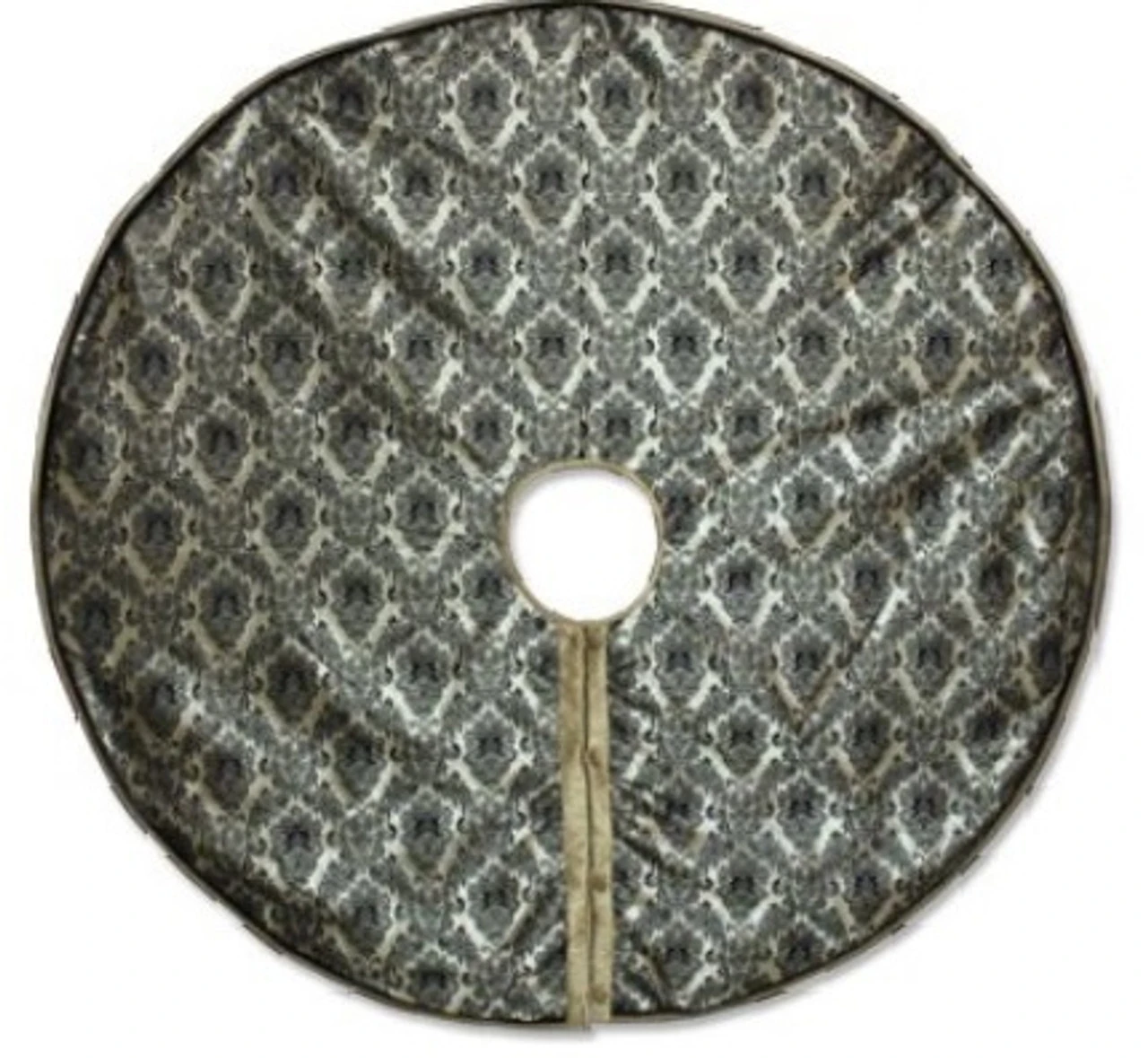 Tree skirt has a sheer overlay that features a black damask design
