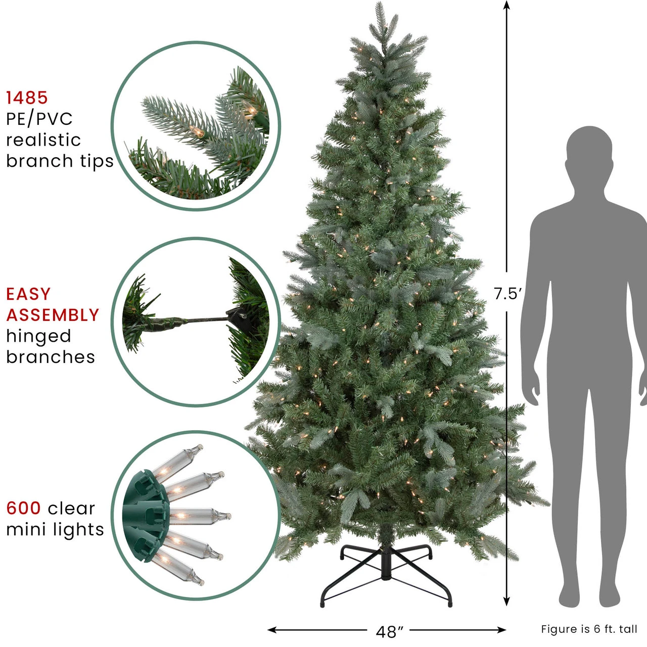 Dimensions: 7.5′ high (from the base of stand to the top of the tree)