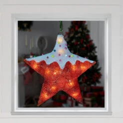 17″ Pre-Lit Green And Red Hanging Christmas Star Window Decor With Bow
