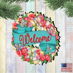 Set Of 2 Butterfly Floral Wreath “Welcome” Wooden ChristmasOrnaments 5.5″