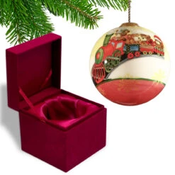 3″ White And Green Holiday Wagon Hand Painted Round Glass Hanging Christmas Ornament