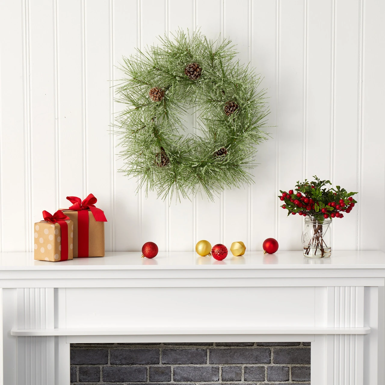 Beautifully accented with lifelike faux pinecones and snow