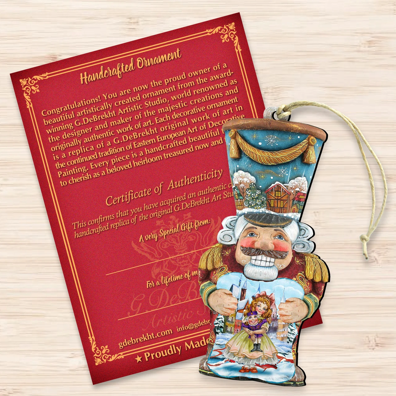 Ornaments depict a Nutcracker presenting an image of a girl with a soldier