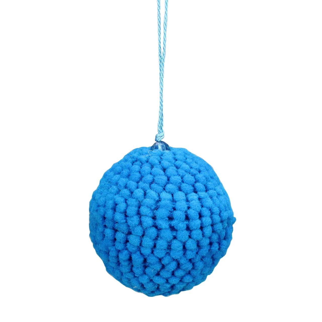Knitted red, orange, green, and blue ball ornaments