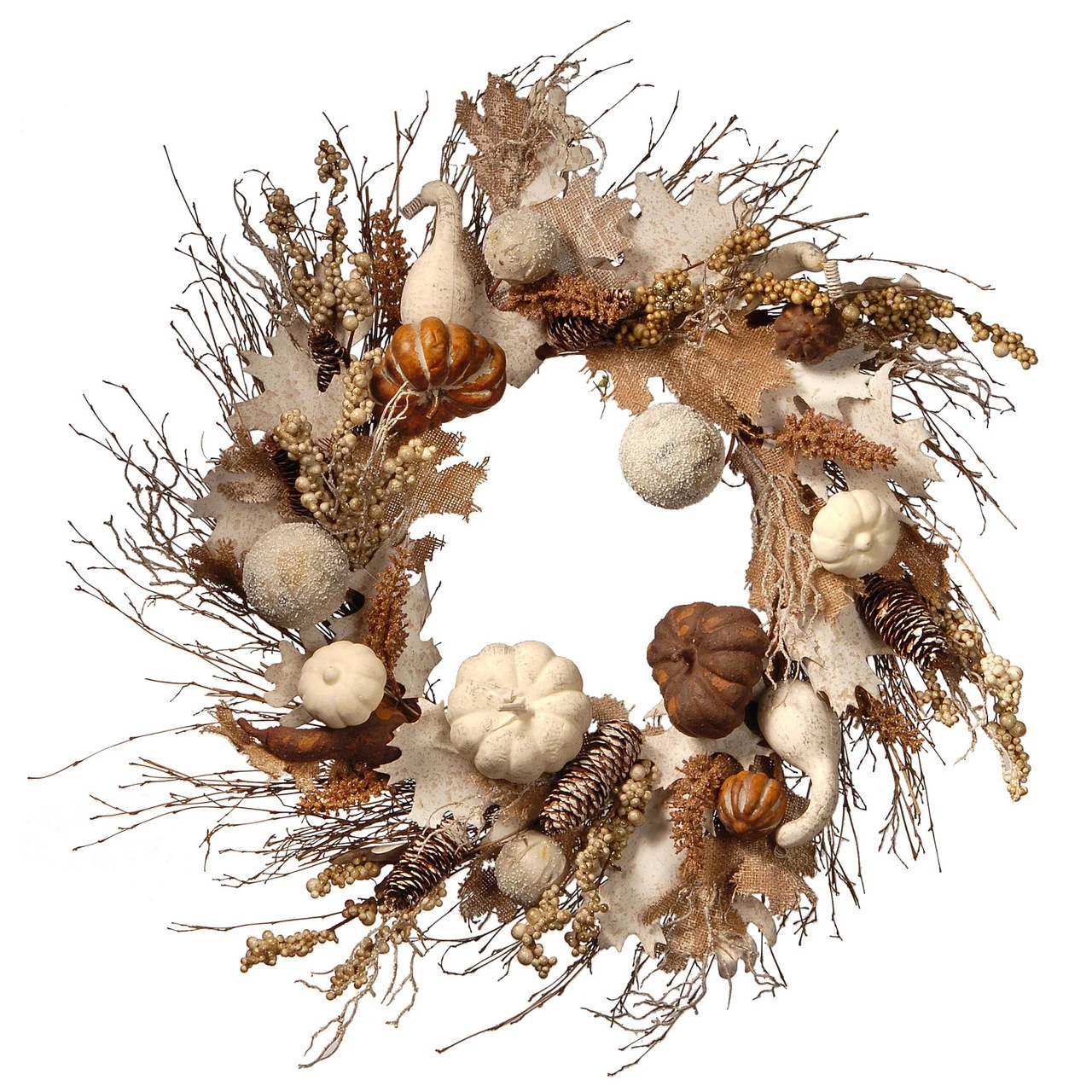 Wreath features assorted leaves in handsome but subdued white hues flowing
