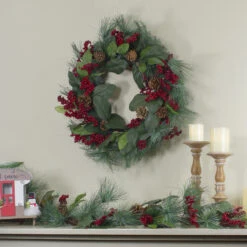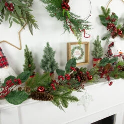 6′ Green Pine Artificial Christmas Garland With Berries And Iridescent Ornaments