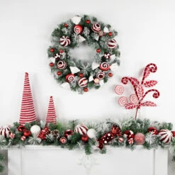 Frosted Pine Artificial Christmas Wreath With Swirled Candy Ornaments, 24-Inch