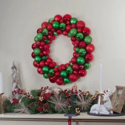 Red And Green 3-Finish Shatterproof Ball Christmas Wreath – 24-Inch, Unlit