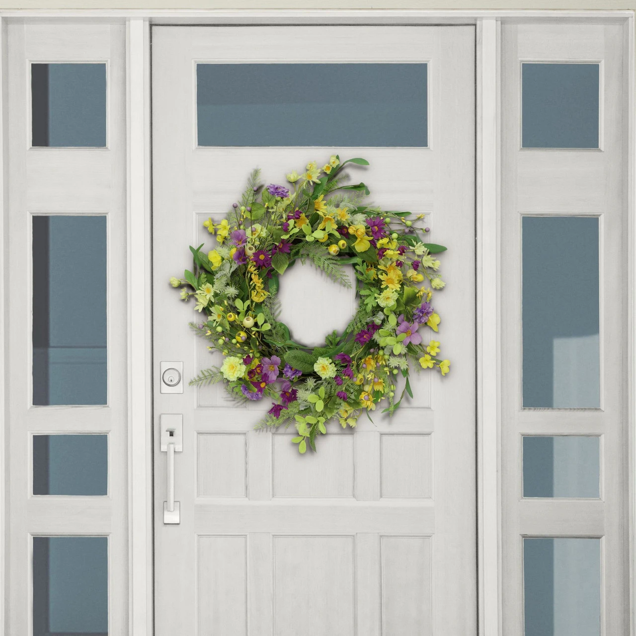 Features a purple lavender and yellow daisy flowers accented mixed spring wreath